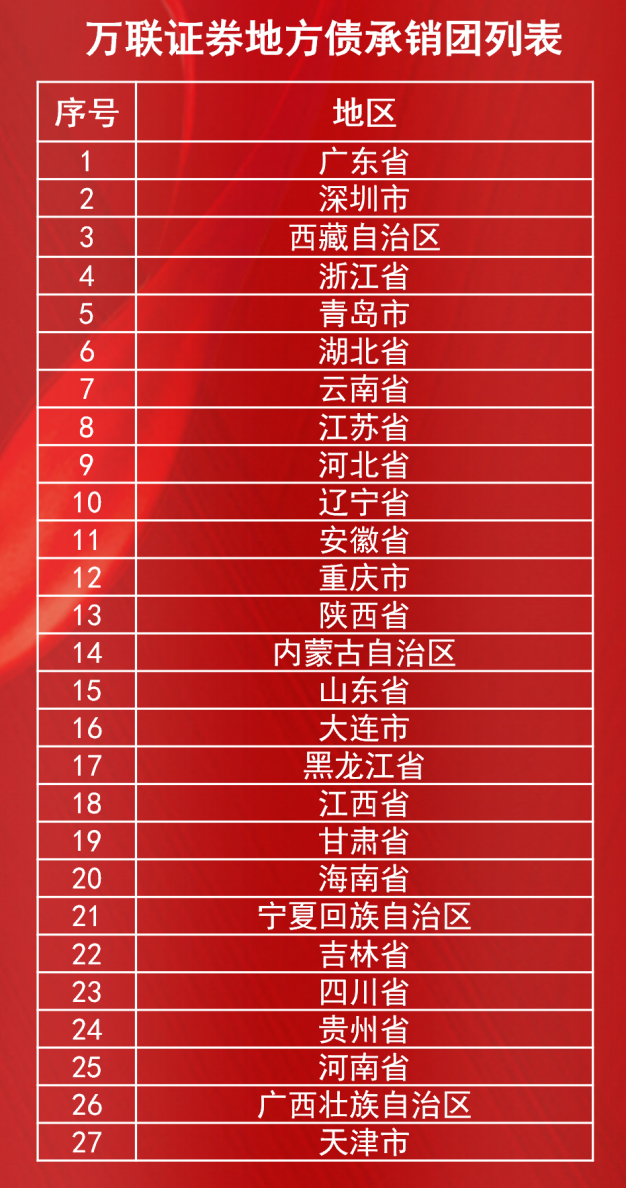 自2006年起,作为国内最早涉足债券承销业务的券商,万联证券积极开展债券承销工作,凭借雄厚的实力、丰富的经验、优质的服务,得到了监管机构、全国各地发行人以及投资者的多方认可,树立了良好的市场口碑,在债券融资服务领域已形成明显的优势。截至目前,万联证券已成为全国27个省、市、自治区的承销团成员。