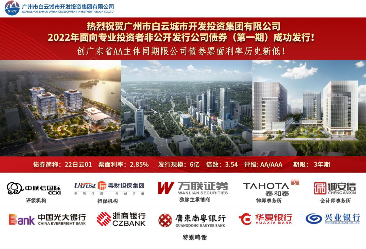 近日,由广州金控集团下属万联证券担任独家主承销商和簿记管理人的“广州市白云城市开发投资集团有限公司2022年面向专业投资者非公开发行公司债券(第一期)”在深圳证券交易所成功发行。本期债券发行规模6亿元,债券期限3年,发行人主体评级AA,债项评级AAA,发行利率2.85%,创广东省AA主体同期限公司债券历史新低,认购倍数达3.54倍。