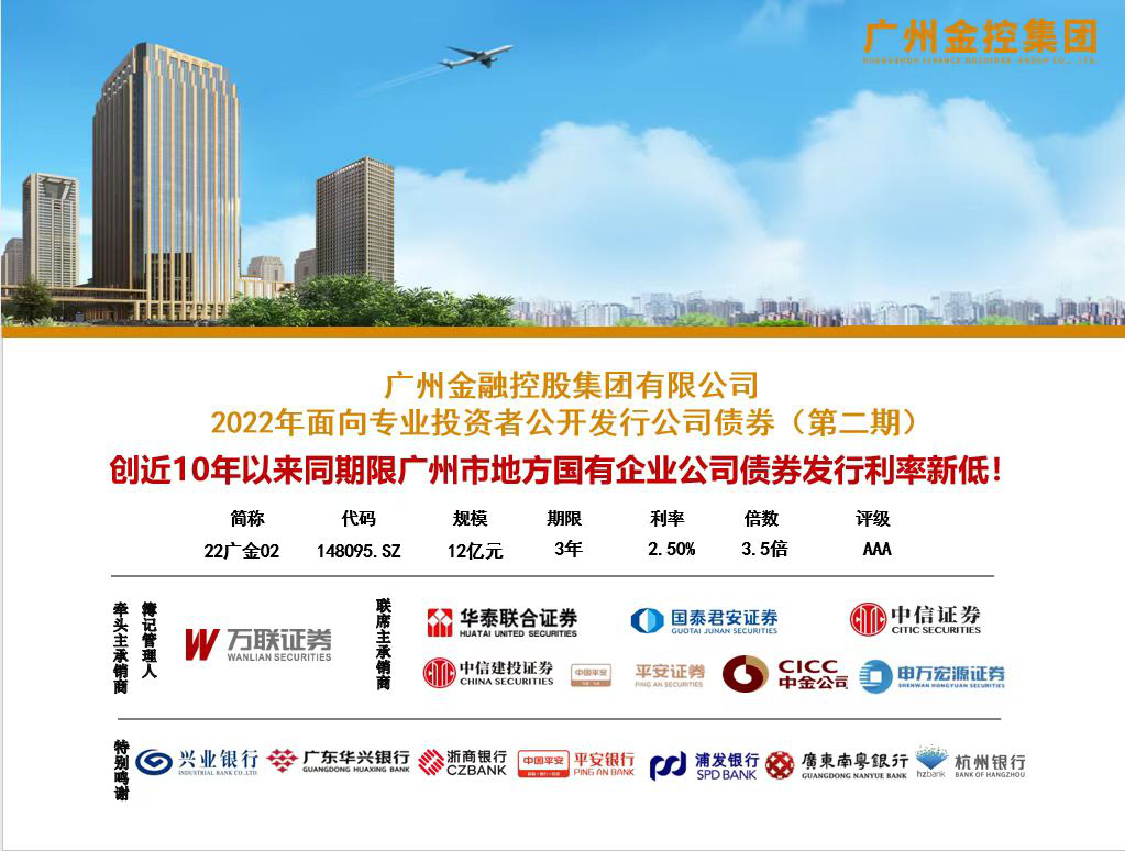 广州金控集团10月19日成功簿记发行3年期公司债券12亿元,全场投标金额42.2亿元,超额认购3.5倍,截标确认利率2.5%,创广州市最近十年3年期公司债发行利率新低。