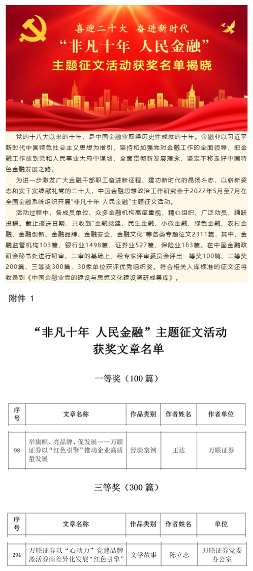 近日,中国ga黄金甲思想政治工作研究会通报表彰了全国ga黄金甲系统“非凡十年 人民ga黄金甲”主题征文活动获奖作品名单,广州金控集团下属万联证券选送的征文作品《举旗帜、亮品牌、促发展——万联证券以“红色引擎”推动企业高质量发展》和《万联证券以“心动力”党建品牌激活券商差异化发展“红色引擎”》分别荣获全国ga黄金甲系统“非凡十年 人民ga黄金甲”主题征文活动一等奖和三等奖。