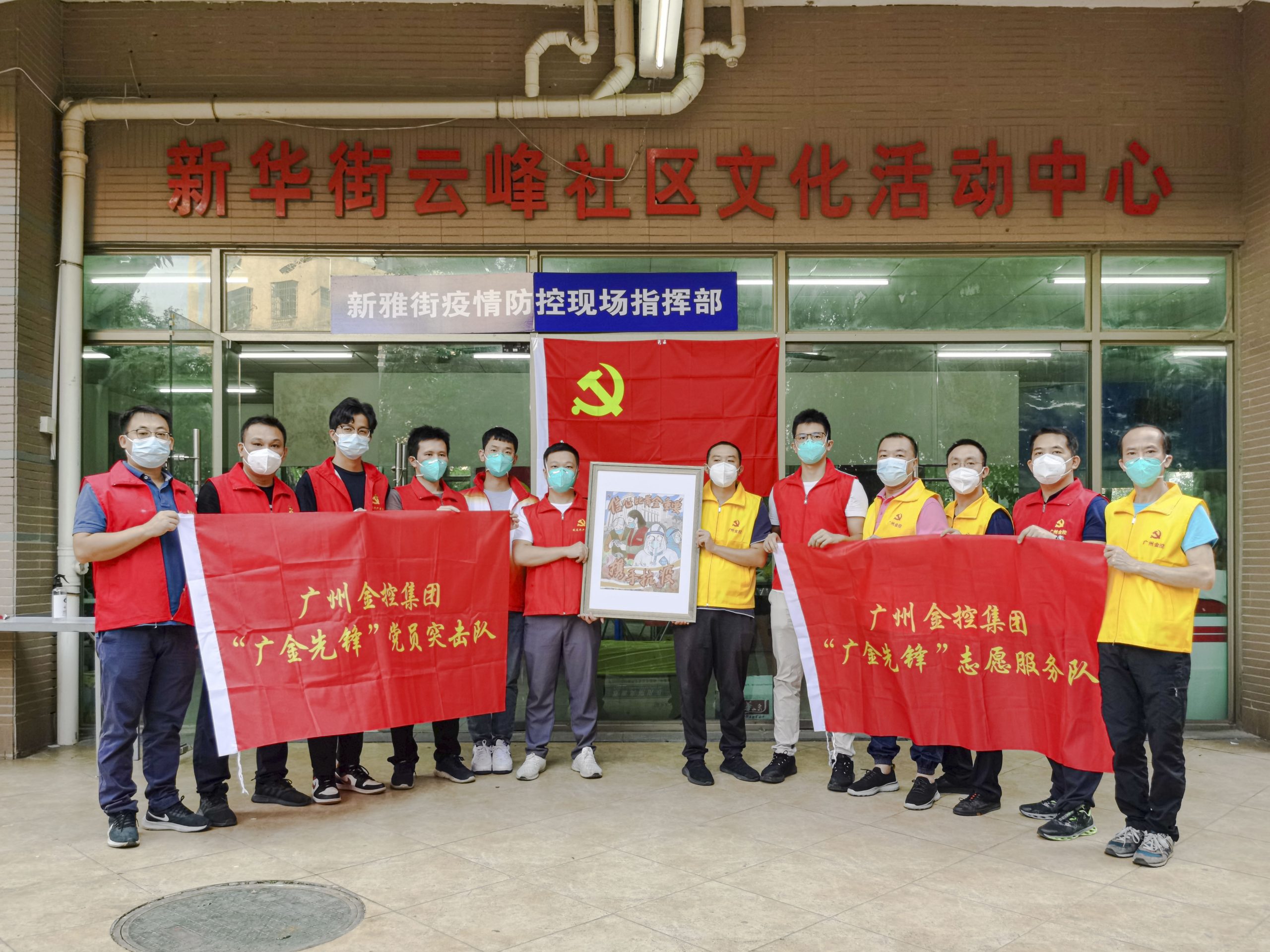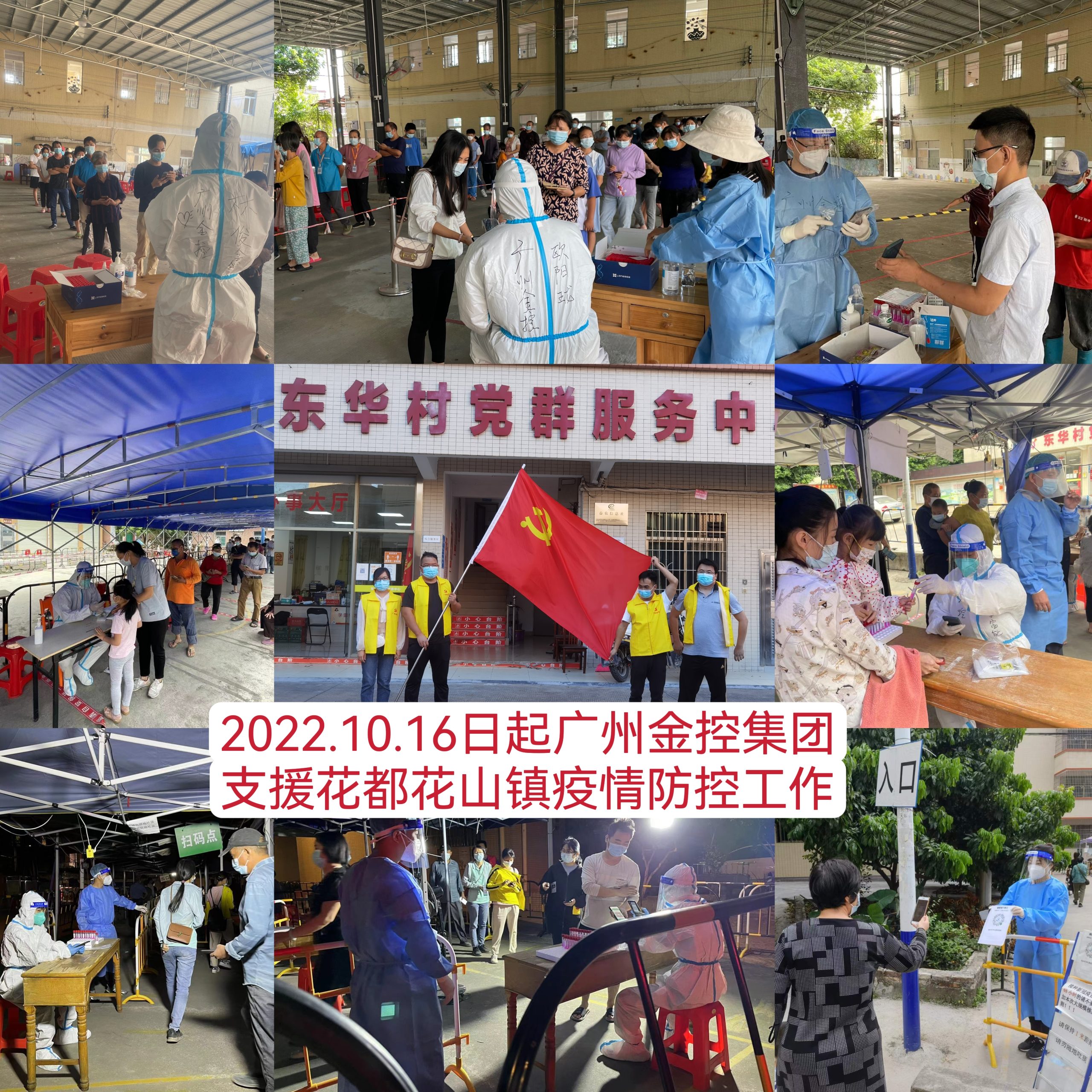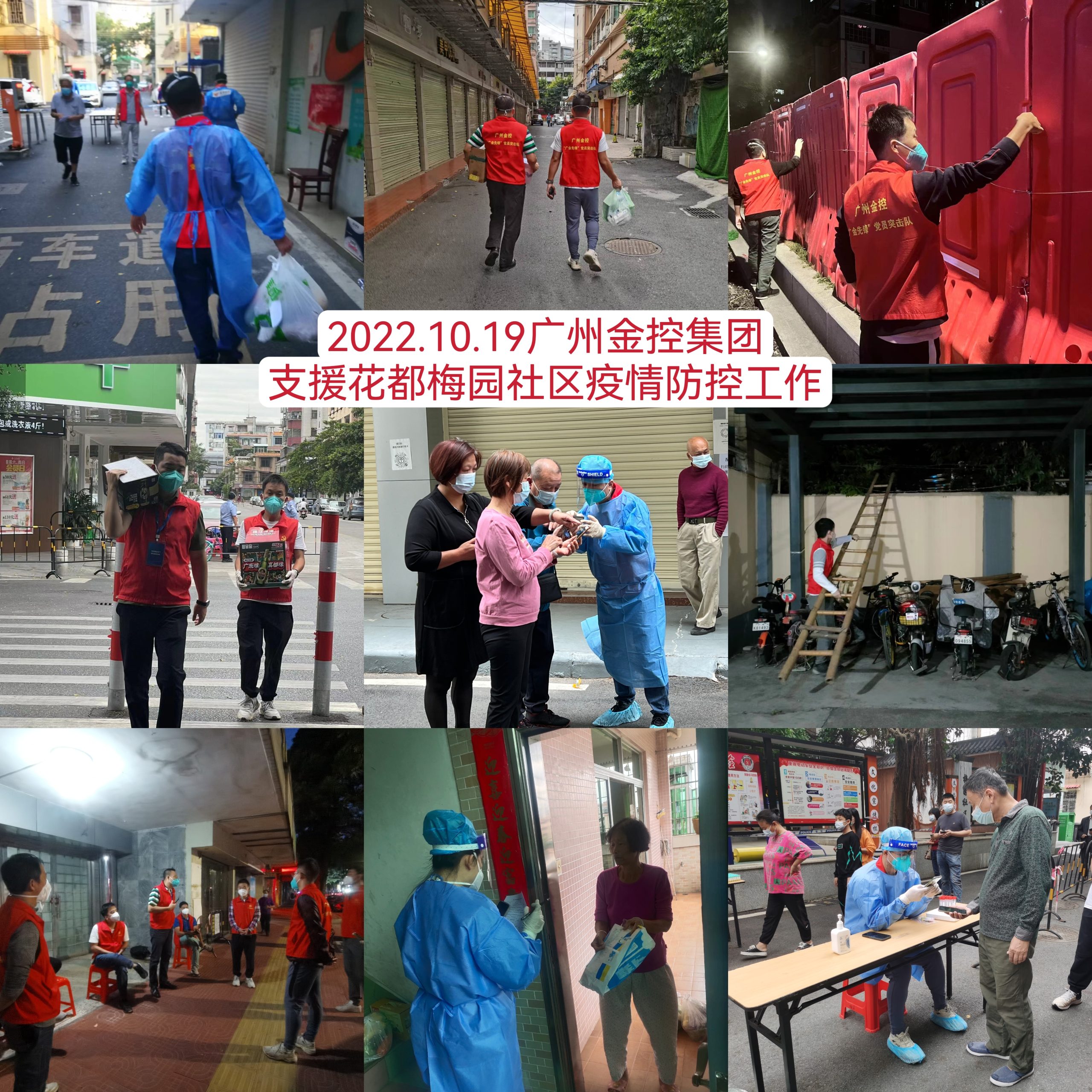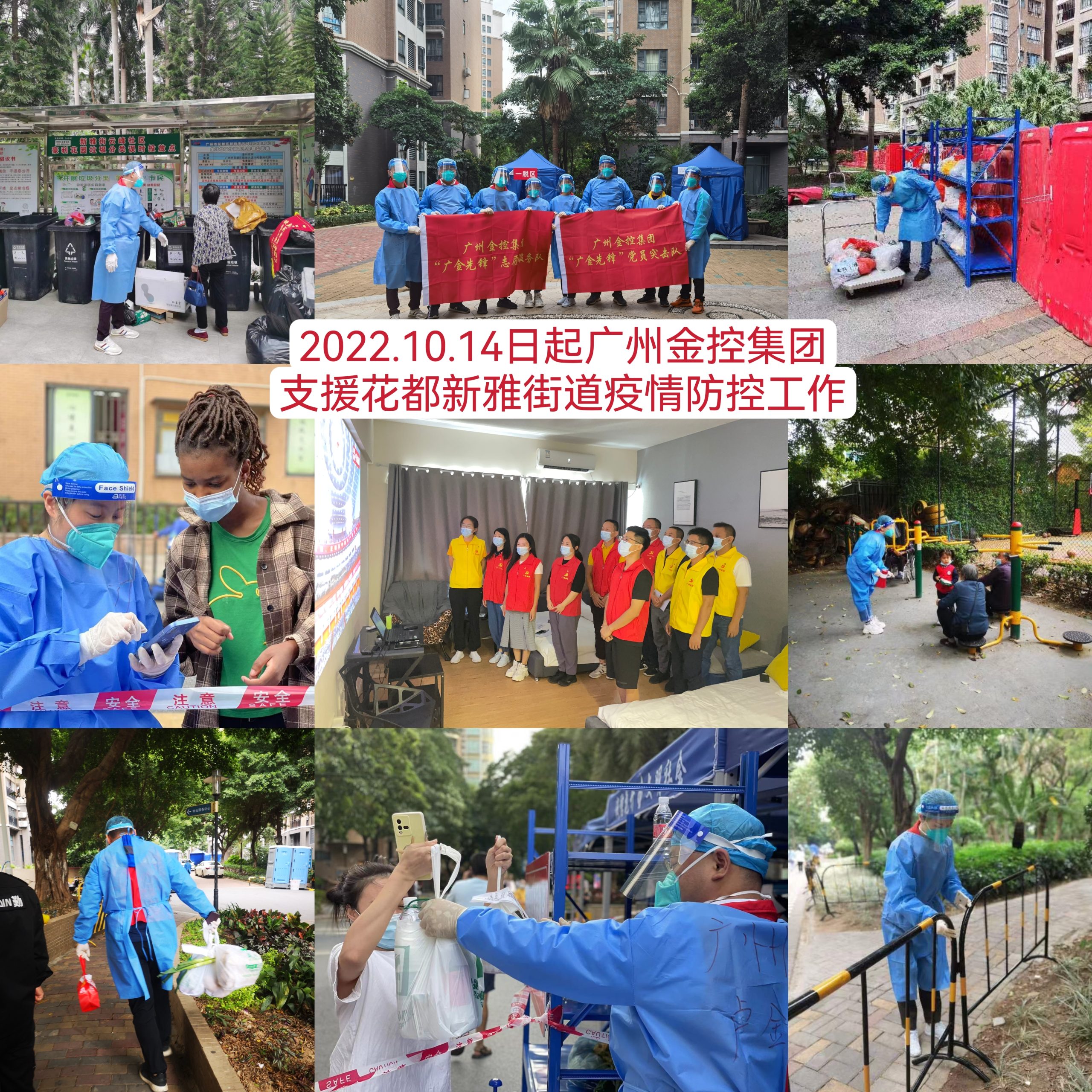 10月13日,广州市花都区新型冠状病毒肺炎疫情防控指挥部发布第70号和第71号通告,全区范围内启动全员核酸检测,暂停堂食,各中小学校、幼儿园暂停返校及线下教学,对部分区域实施临时管控措施。接到市委组织部及市国资委支援花都区疫情防控的紧急任务后,广州金控集团紧急组织“广金先锋”党员突击队、志愿服务队逆行出征,截至10月25日,共派出74名“广金先锋”队员奔赴花都新华街道、新雅街道、花山镇等地支援抗疫。
