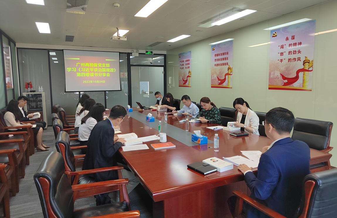 10月24日,广州金控集团下属广州市融资再担保有限公司党支部开展“第一议题”学习暨学习《习近平谈治国理政》第四卷读书交流活动,把党的二十大精神与《习近平谈治国理政》第四卷结合起来深入开展学习,通过学习不断提高公司党员干部的“政治三力”,不断增强捍卫“两个确立”、做到“两个维护”的高度自觉,推动党员干部学懂弄通做实习近平新时代中国特色社会主义思想,努力开辟广州再担保发展新境界。