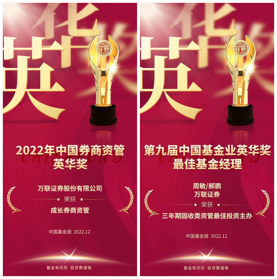 中国基金业“英华奖”是国内基金行业聚焦投资人才的权威奖项,注重考察基金经理的中长期投资能力,以评奖考察区间的长期性和客观量化而著称,奖项具备较高含金量。九年多来,英华奖榜单评选出一大批经过市场检验,具备深厚研究功底、高超投资能力和良好的职业操守、战胜了市场长期波动的一流投资人才。本次能够荣获英华奖“成长券商资管英华奖”“三年期固收类资管最佳投资主办”两项大奖,是市场、媒体和公众对万联证券资管长期主动管理能力的认可,将更加激励万联证券在专业资产管理人的道路上奋楫笃行。