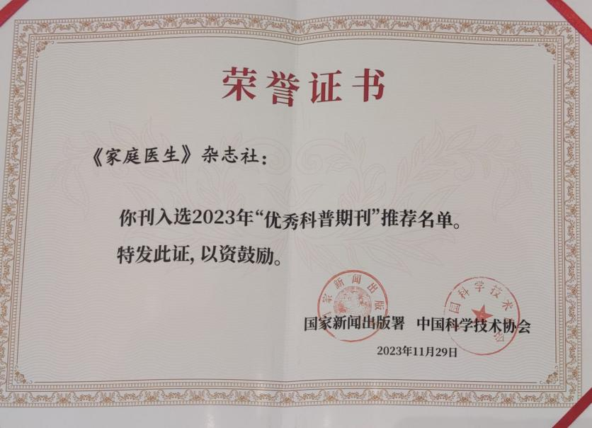 “优秀科普期刊”项目是国家新闻出版署引导期刊界更好地服务国家科普能力建设的重要举措之一,旨在促进期刊优秀科普作品的阅读传播,引导广大期刊做优做强科普宣传。《家庭医生》自创刊以来,积极响应党和国家的科普方针政策,始终坚持面向人民生命健康,聚焦健康热点,传播科学健康观;始终坚持内容质量第一,坚持科学性、思想性、创新性、通俗性的有机统一;始终坚持创新科普传播内容和形式,并与时俱进,大力推动融媒体出版转型,致力于建设国内最具影响力的健康科普与健康教育服务平台。