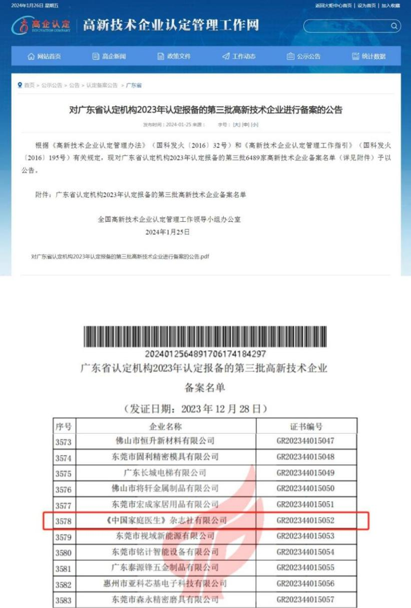 近日,全国高新技术企业认定管理工作领导小组办公室发布《对广东省认定机构2023年认定报备的第三批高新技术企业进行备案的公告》,广州金控集团旗下《中国家庭医生》杂志社有限公司(以下简称家医杂志社)顺利通过复审,这是家医杂志社继2020年首次认定后,再次获得国家“高新技术企业”认定。