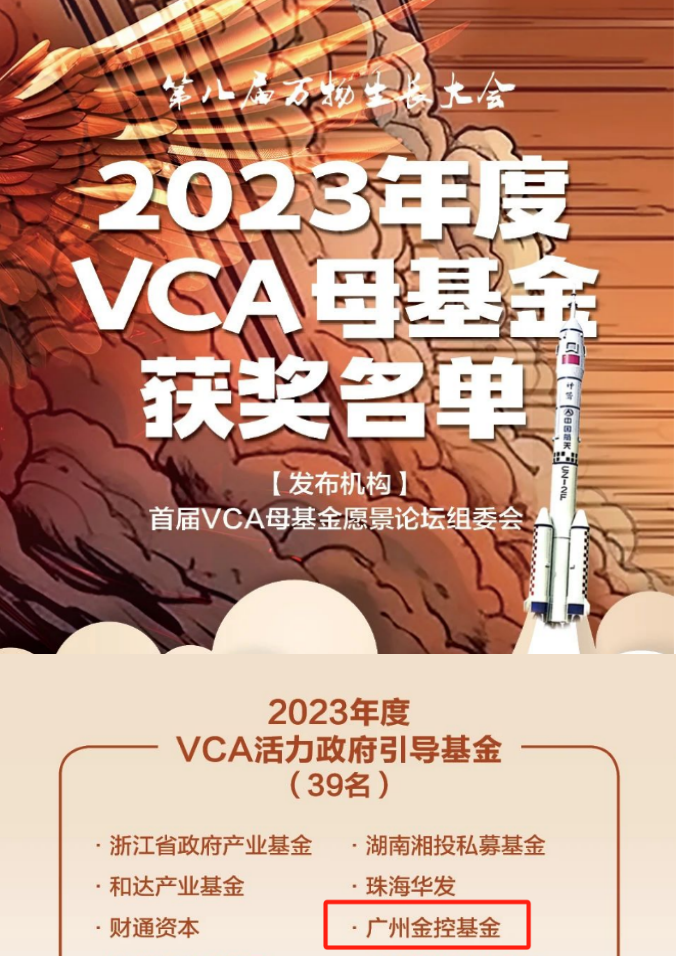 4月下旬,“VCA母基金愿景论坛”在杭州举办,“2023年度VCA活力政府引导基金榜单”隆重揭晓,广州金控集团旗下广州金控基金荣誉上榜。