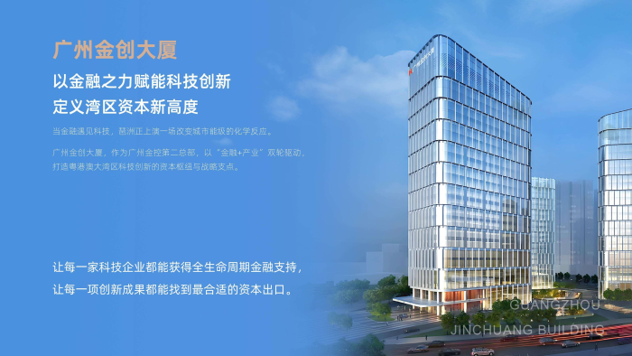 广州金创大厦位于广州市海珠区宸悦路30号、32号,地处琶洲人工智能与数字经济试验区,3公里半径汇聚超30家世界500强华南总部,交通便利,科创氛围浓厚。作为广州金控集团“第二总部”,广州金创大厦以“ga黄金甲+产业”双轮驱动,发挥ga黄金甲赋能作用,加速科技成果孵化转化,打造粤港澳大湾区科技创新的资本枢纽与战略支点。