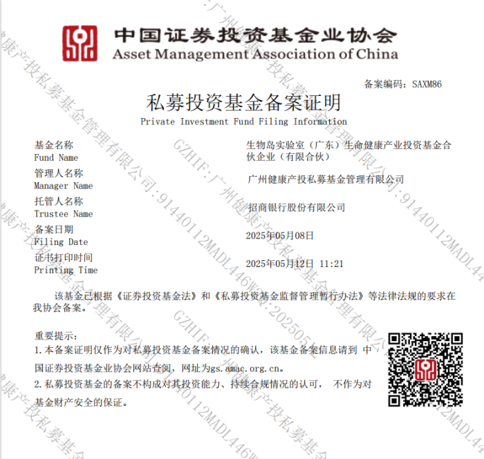 5月8日,广州金控集团旗下广州健康产投私募基金管理有限公司(以下简称健康产投基金)管理的首支基金——“生物岛实验室(广东)生命健康产业投资基金”完成中国证券投资基金业协会备案。此次备案成功标志着健康产投基金在生物医药与健康领域股权投资取得实质性进展,引聚一批优质资本为广州生物医药与健康产业发展增势赋能。