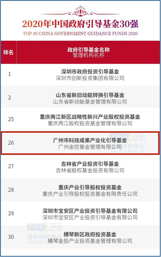 8月12至13日,清科研究中心联合投资界主办的“第十四届中国基金合伙人峰会”在上海举行,揭晓了2020年中国股权投资基金有限合伙人榜单。广州金控下属广州金控基金管理有限公司(下称广金基金)所管理的广州市科技成果产业化引导基金荣登“2020年中国政府引导基金30强”。