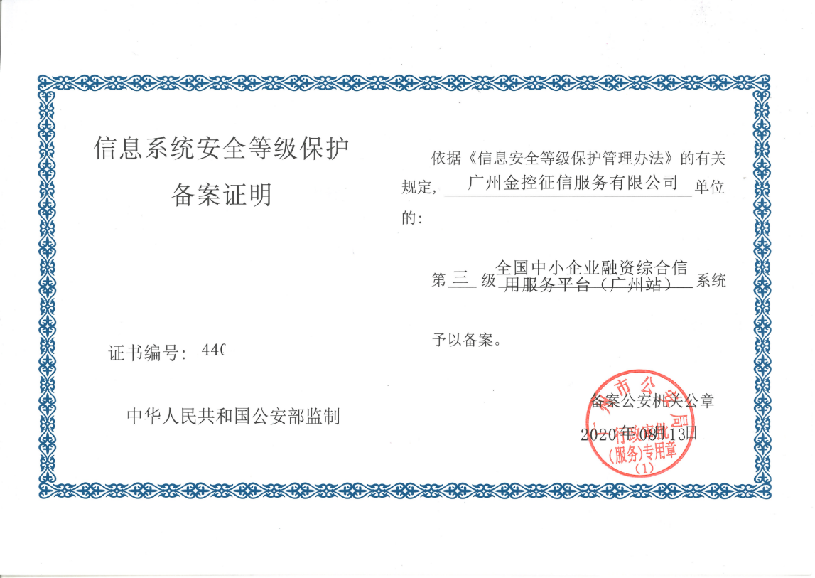 近日,广州金控旗下广州金控征信服务有限公司(下称“广金征信”)负责建设运营的广州信易贷平台通过国家信息系统安全等级保护三级认证,这标志着广金征信在业务信息安全水平和系统服务安全水平等方面均已达到国家非银行机构的最高级认证标准。