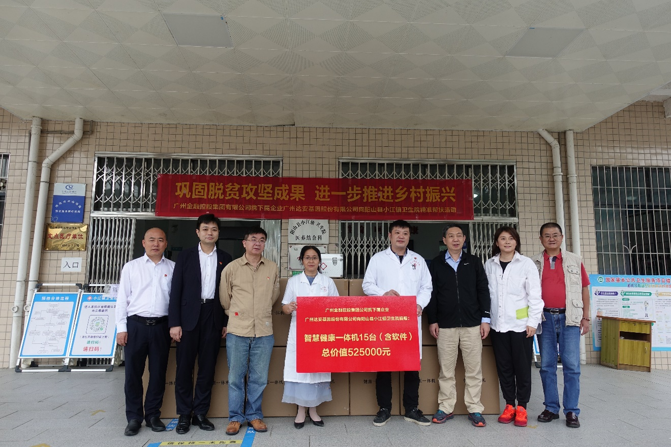 调研组深入小江镇下坪村、罗汉村、沙寮村,调研党史教育基地“阳山人民武装起义陈列室(纪念碑)”、千年银杏旅游项目、梦花湾田园综合体,并慰问困难户,看望驻村第一书记。调研组出席广州金控集团属下企业广州达安基因公司与小江镇卫生院三年结对帮扶签约仪式,并现场捐赠15台智慧健康一体机(总价值52.5万元)。进一步改善小江镇卫生院医疗卫生设施条件,提升医疗卫生服务能力,惠及更多群众。
