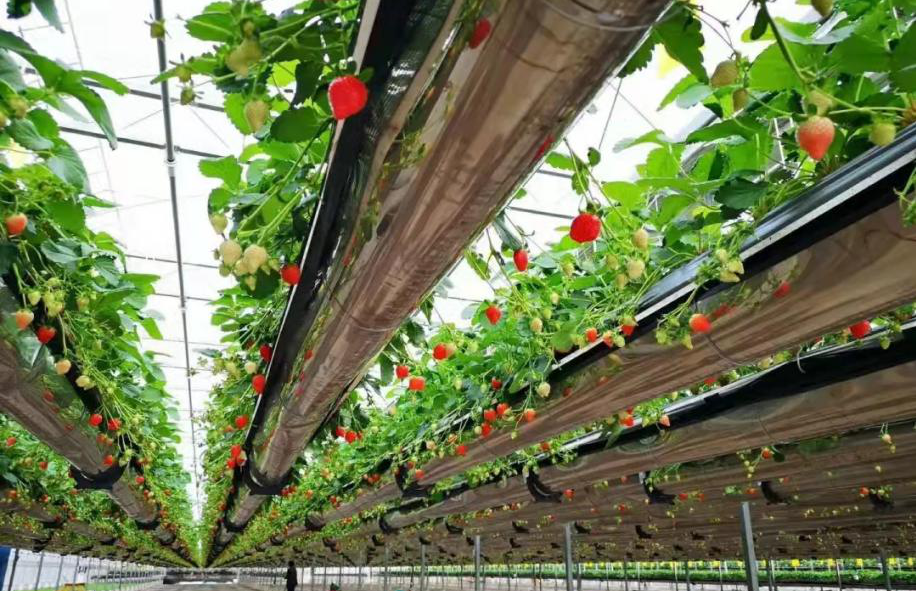 (15亩空中草莓园使用可升降栽培床、数控化营养液循环系统与精准施肥系统的新型培育方式,令土地利用率提高约40%,高光合作用且无地面尘土、无虫害污染也极大提升草莓品质。)