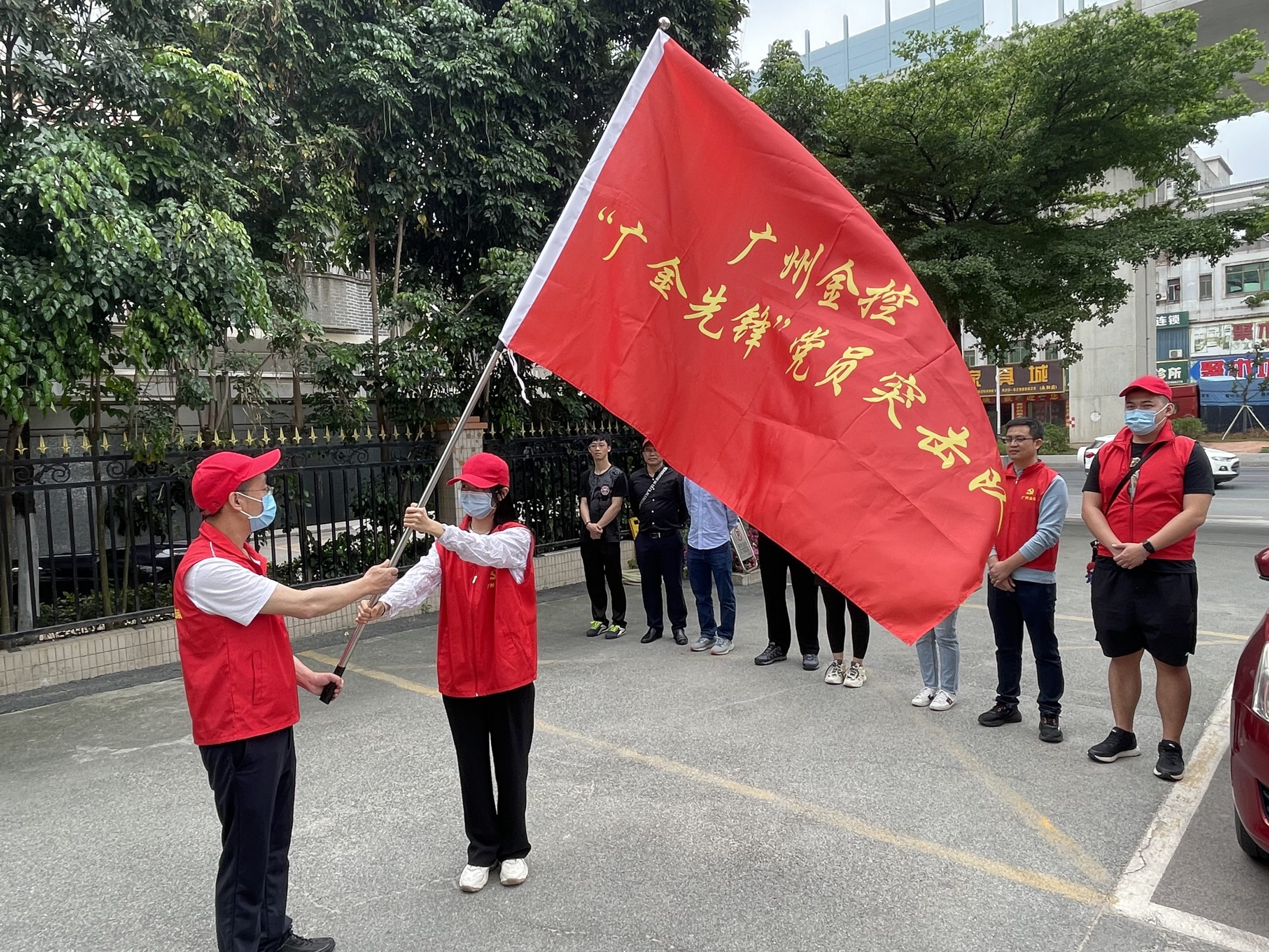 最后,第一批队长朱辉文同志郑重地将广州金控“广金先锋”党员突击队旗帜移交给新任副队长黄小晴同志。老队员们将红马甲和帽子叠整齐,移交给新队员。
