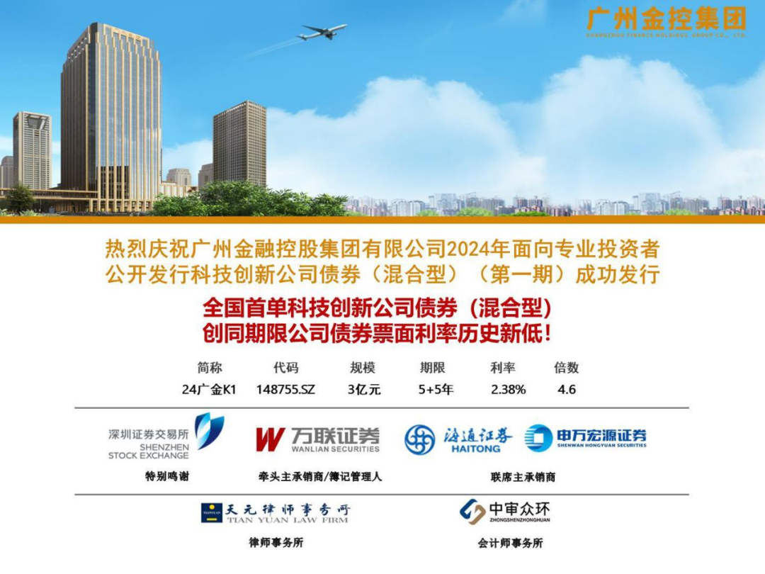 2024年6月4日,广州ga黄金甲控股集团有限公司2024年面向专业投资者公开发行科技创新公司债券(混合型)(第一期)在深圳证券交易所(以下称深交所)成功发行。本期债券发行规模3亿元,期限5+5年,票面利率2.38%,全场认购倍数达4.6倍,发行利率创同期限公司债券票面利率历史新低。