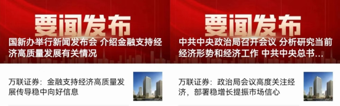 万联证券主动作为,依托机制优势,以“三个紧抓” 积极推动提振资本市场政策宣传解读。紧抓宣传时效,通过信息传导机制,打通研究宣传关节,确保在政策发布后第一时间引导正向解读;紧抓宣传广度,在多家权威央媒和行业主流媒体发布解读文章十余篇次,提升对最新政策宣传解读的高度、广度,确保多层媒体传达不同受众;紧抓解读质量,紧密围绕会议和政策重点,引导受众理解政策,提振信心,确保守正创新扩大解读宣传影响。据不完全统计,万联证券近期解读宣传新闻媒体点击量逾千万,取得了极佳的社会宣传效果。