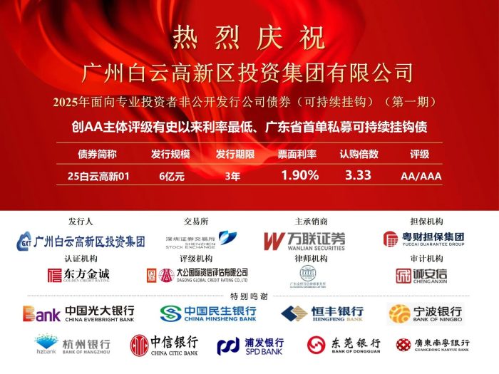 近日,广州金控集团旗下万联证券助力广州白云高新区投资集团有限公司成功发行2025年面向专业投资者非公开发行公司债券(可持续挂钩)(第一期)。债券发行规模6亿元,期限3年期,票面利率1.90%,全场认购倍数3.33倍,创下广东省首单私募可持续挂钩债券、全国AA级主体债券利率最低、同主体级别首只票面利率低于2.00%的公司债券等纪录。