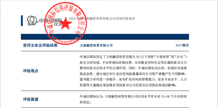 此次中诚信国际确认立根租赁主体信用等级为AA+并维持展望稳定,是资本市场对立根租赁信用资质、经营成果及未来发展潜力的权威肯定。这一重要里程碑不仅将进一步提升立根租赁的市场信誉和融资效率,更为立根租赁未来实现更高质量、更可持续的发展奠定了坚实的信用基础。